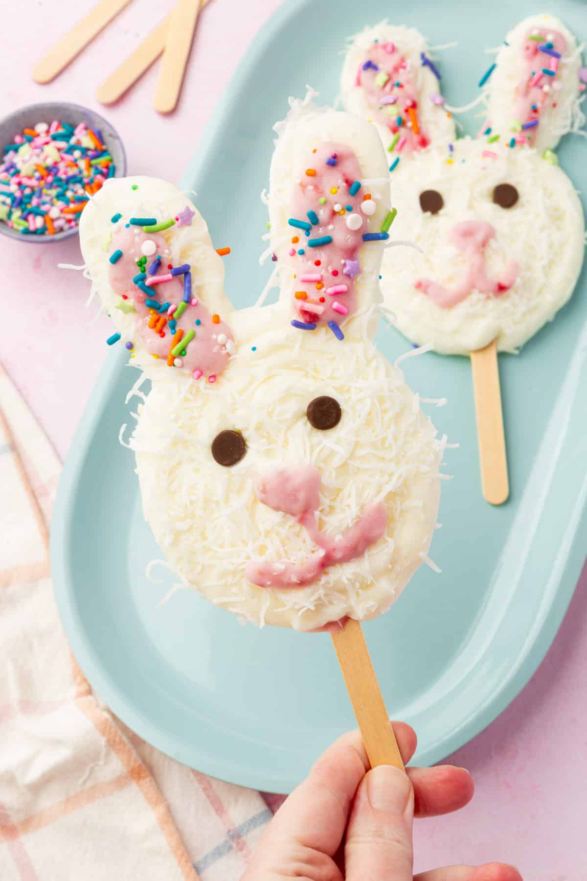 - Cover the popsicle stick with a little extra yogurt where it meets the bunny to hold it in place.
