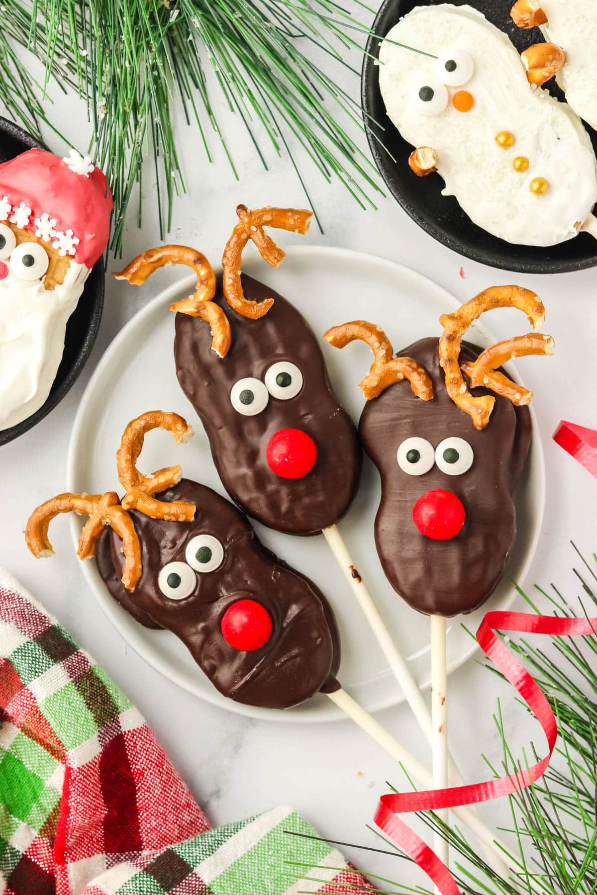 - Nutter Butter cookies: The peanut shape is perfect for a reindeer face. The smaller end becomes the nose area and the larger end holds the antlers.